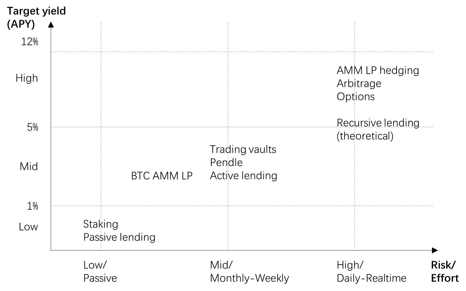 Now we have wrapped, staked, or restaked BTC that can be used in DeFi protocols. Let’s explore where and how to farm. Similar to our last article https://blog.1token.tech/stablecoin-defi-yield-farming-in-2025-efforts-required-and-target-yield/, we categorize BTC yield strategies into three main groups: low, mid, and high effort, risk, or yield. Usually, higher yields involve more effort and greater risk. These categories correspond to different types of investor profiles and infrastructure needs.