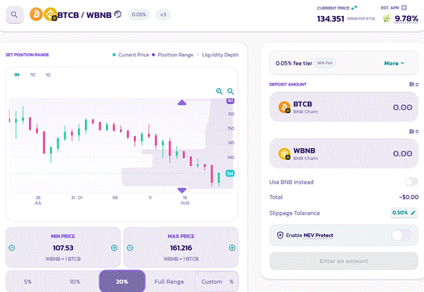 - Provide liquidity in the ETH/BTCB pool (e.g., Pancakeswap)