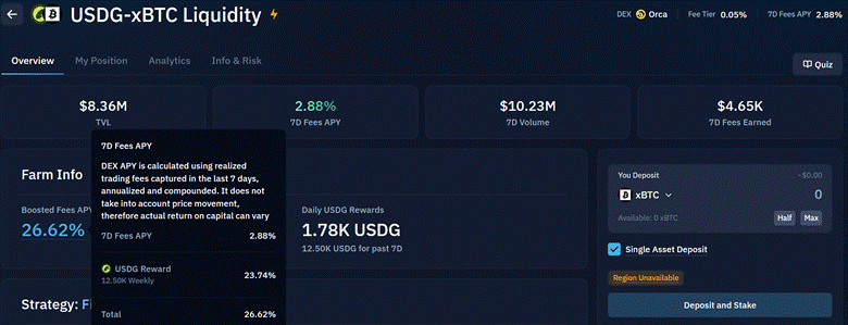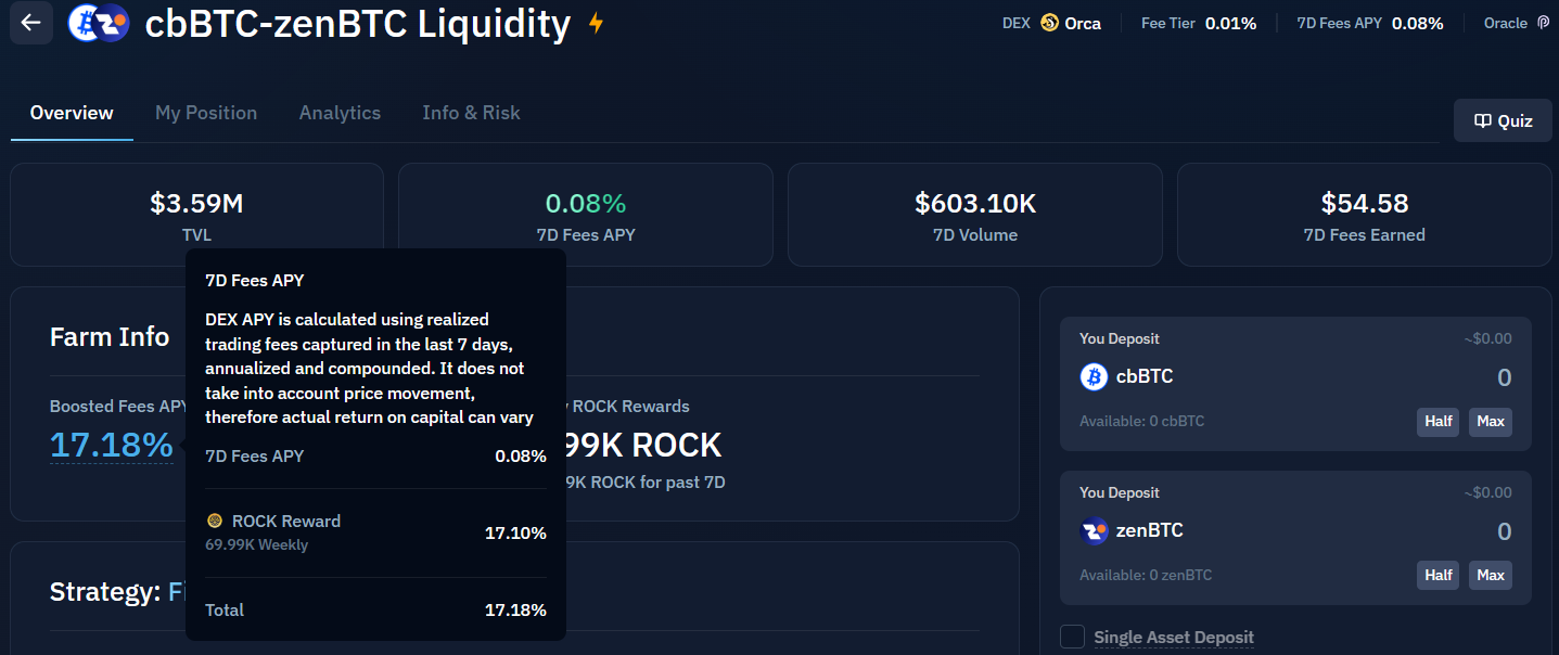 For higher yields, the user can consider newer protocols, which tend to be incentivized with underlying points/token rewards. For example, the Kamino cbBTC-zenBTC pool below has a 17% APY primarily generated from ROCK reward tokens (a bridge token to the SOL chain is required)