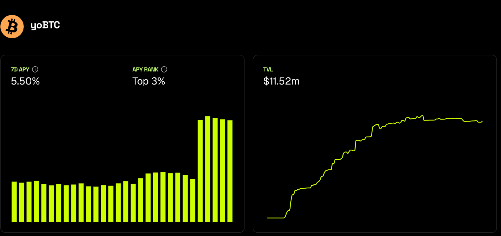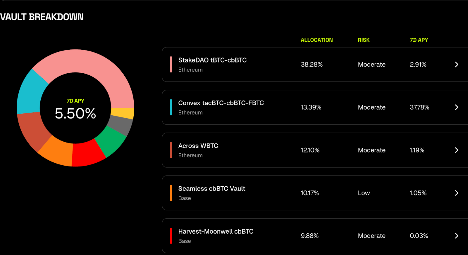 For example, the yoBTC vault from yo.xyz has been generating 5.5% APY and allocates the deposited BTC into the following strategies: