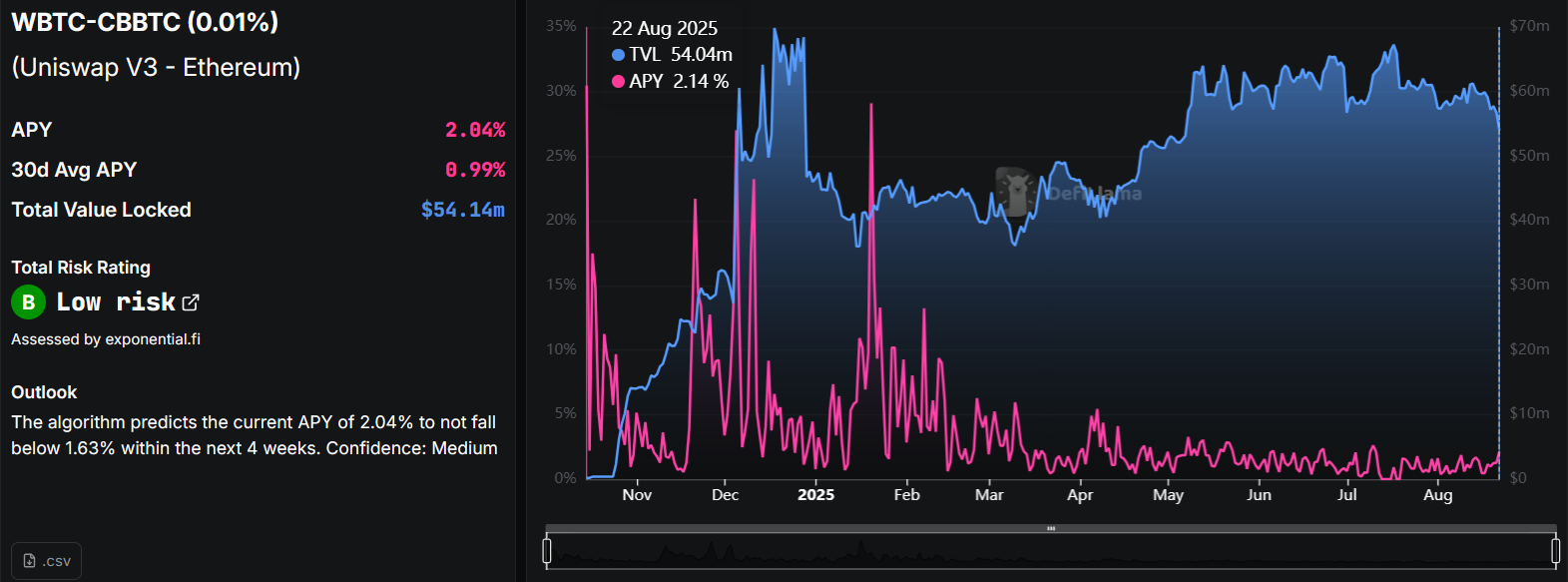 A medium-risk/medium yield strategy involves depositing liquidity into a Uniswap pool with correlated Bitcoin assets, such as cBBTC/WBTC, with minimal risk of impermanent loss. The Uniswap WBTC-cBBTC pool is currently yielding an APY of 2.04%