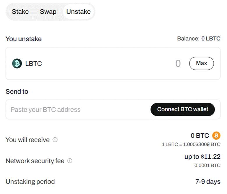 - Redeeming LBTC or eBTC has a 7-9 day cooldown period.