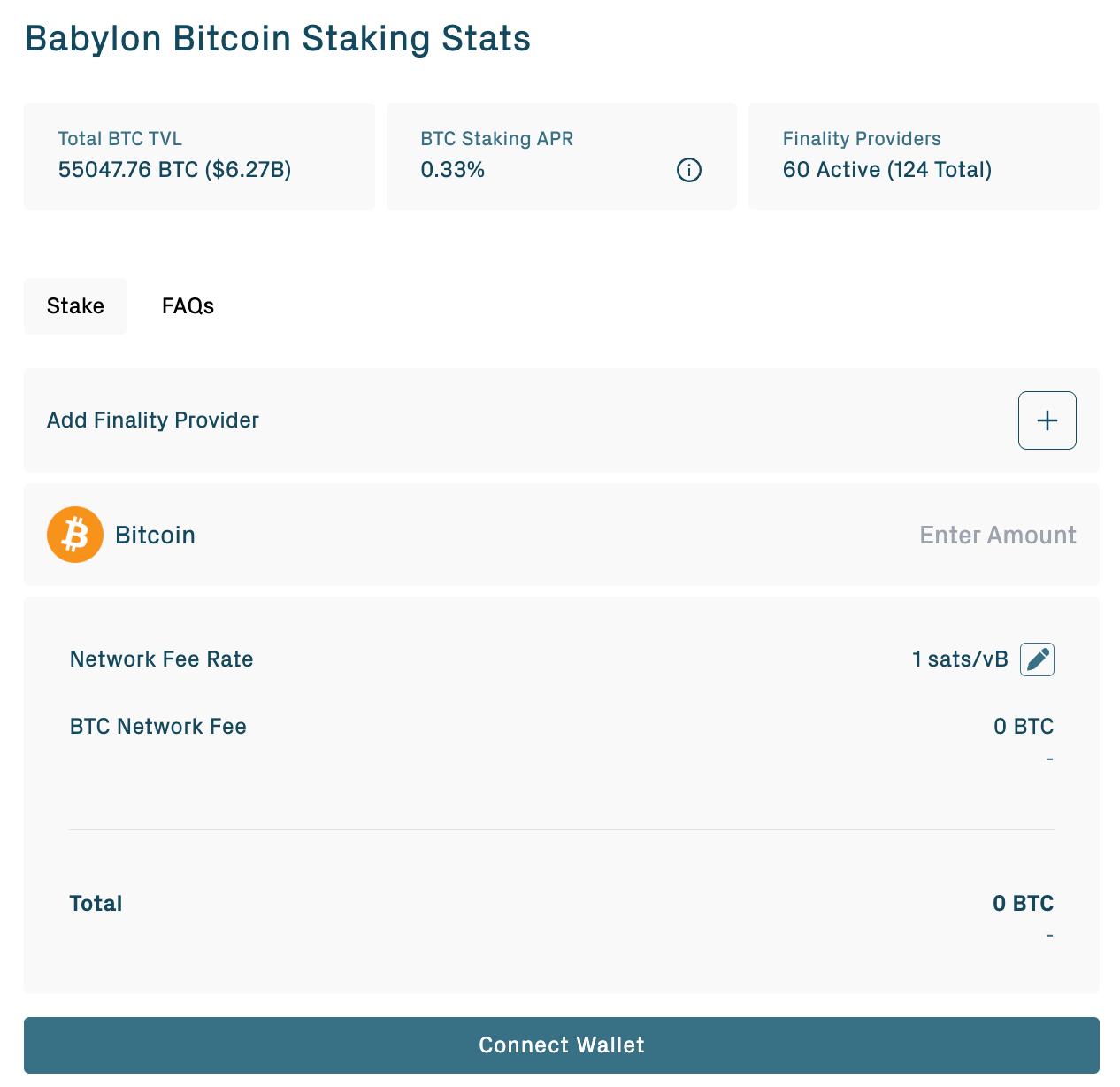 The most popular way to stake Bitcoin today is through the Babylon Protocol. The staker receives a base yield of 0.33% APY plus BABY tokens as incentive rewards.