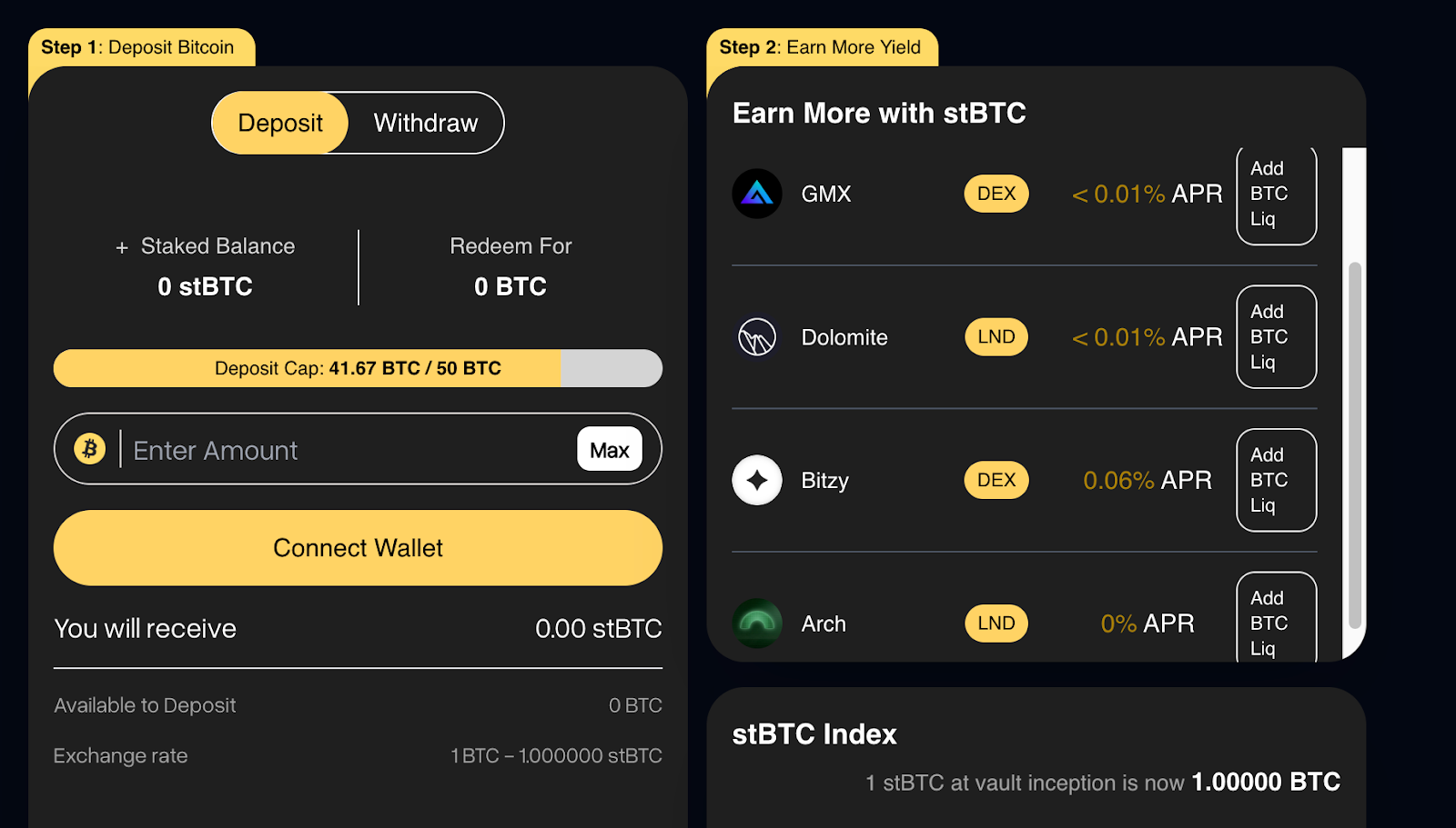- Deposit the stBTC into dapps like Bitzy and earn more yield