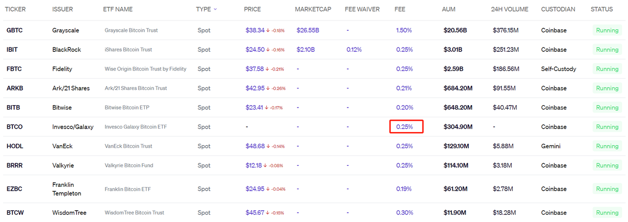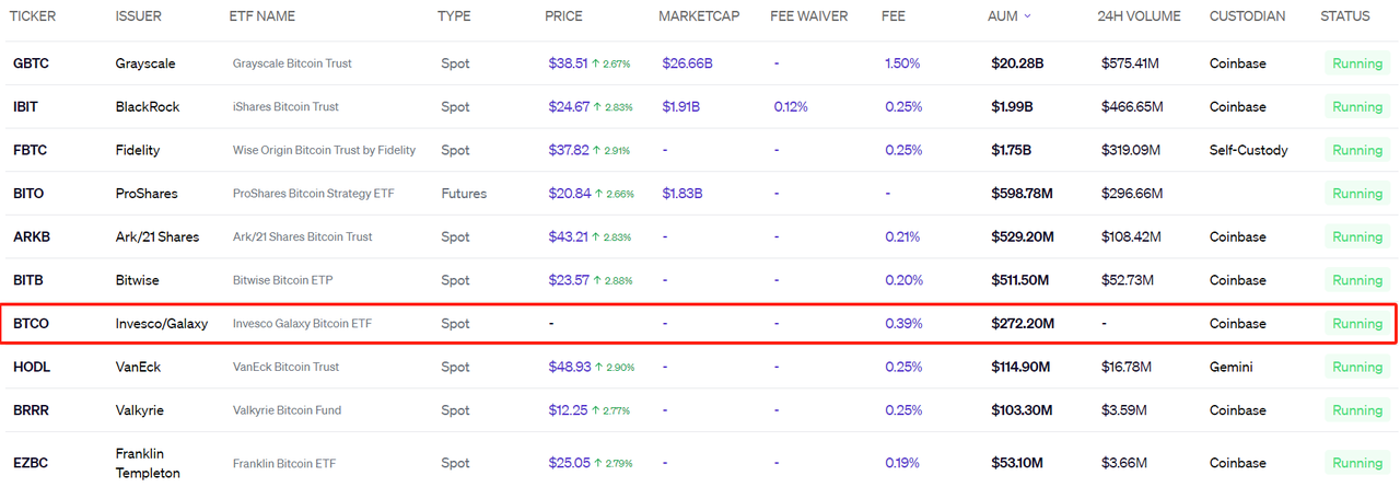 Invesco and Galaxy’s spot bitcoin ETF is ranking at the medium-low among all spot ETFs in terms of AUM.