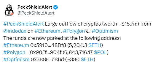 According to Peckshied post, Indodax had a large outflow of $15.7 million worth of coins.