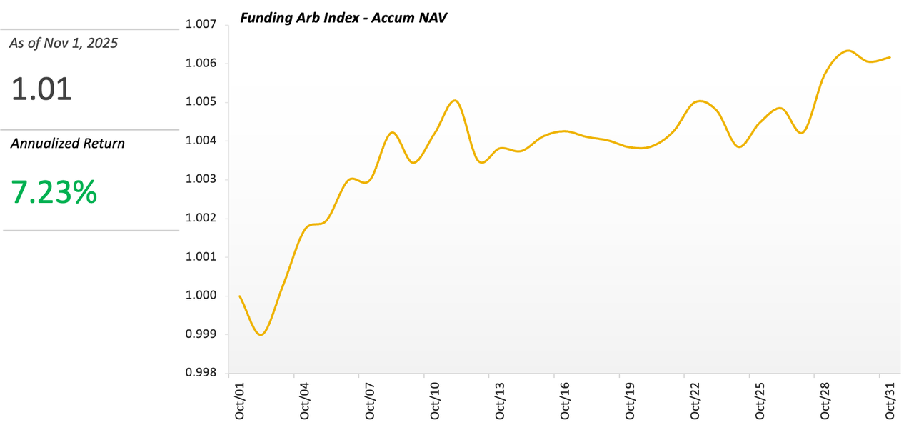 We have retrieved the assets of multiple crypto trading teams to the same starting point (October 1st at UTC 0) utilizing a historical retrieving mechanism, calculating the accumulated NAV for each team using the TWR (Time-Weighted Return) measure, and then taking the arithmetic mean to derive an index benchmark that represents the market’s Funding Arbitrage.