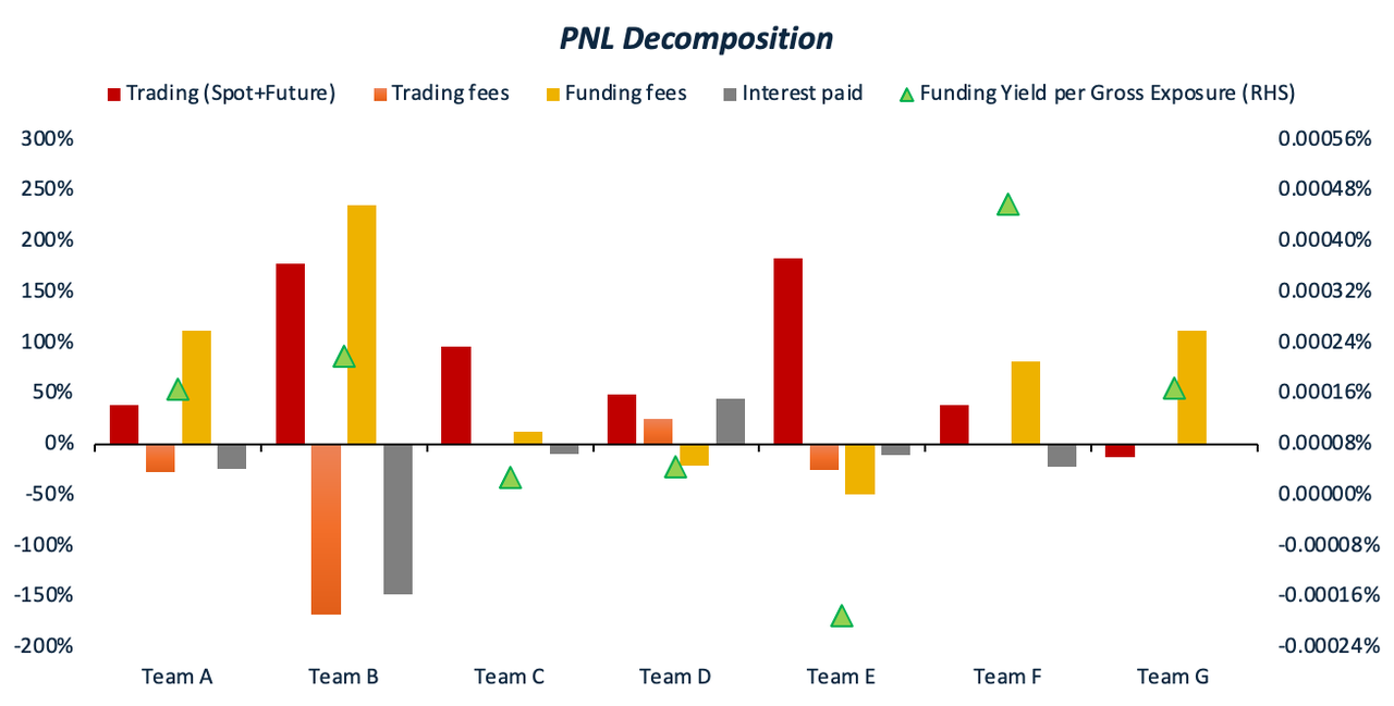 The perpetual contract funding rate management capability serves as a critical performance indicator for Funding Arbitrage strategies. In this report, we analyze October 2025 execution records across all participating teams, decomposing strategy returns into discrete components including funding income, trading fees, interest paid, and trading P&L. A higher proportion of funding income relative to total returns reflects greater proficiency in funding rate management.