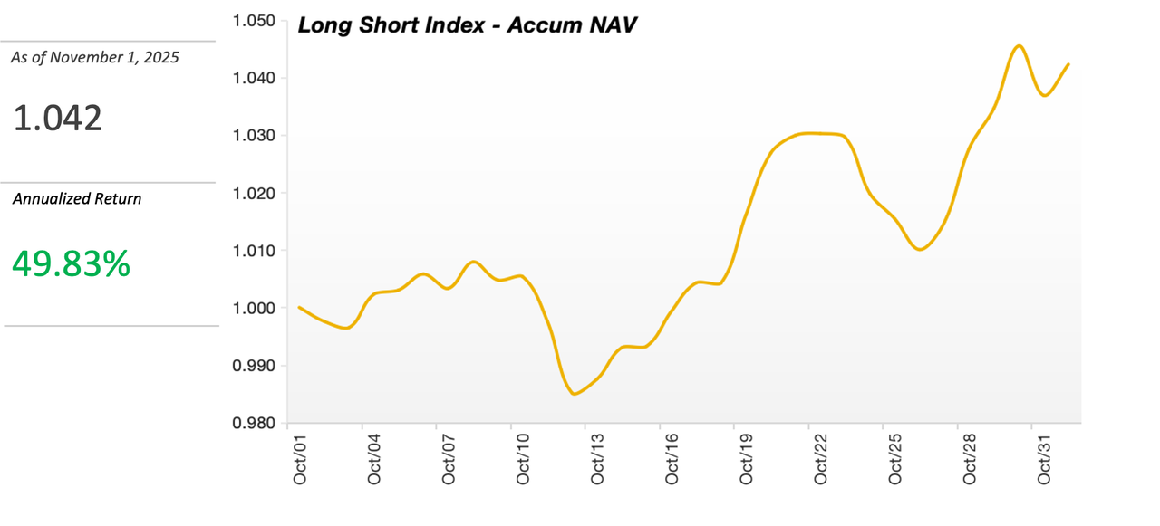 We have retrieved the assets of multiple crypto trading teams to the same starting point (October 1st at UTC 0) utilizing a historical retrieving mechanism, calculating the accumulated NAV for each team using the TWR (Time-Weighted Return) measure, and then taking the arithmetic mean to derive an index benchmark that represents the market’s Long Short strategy.