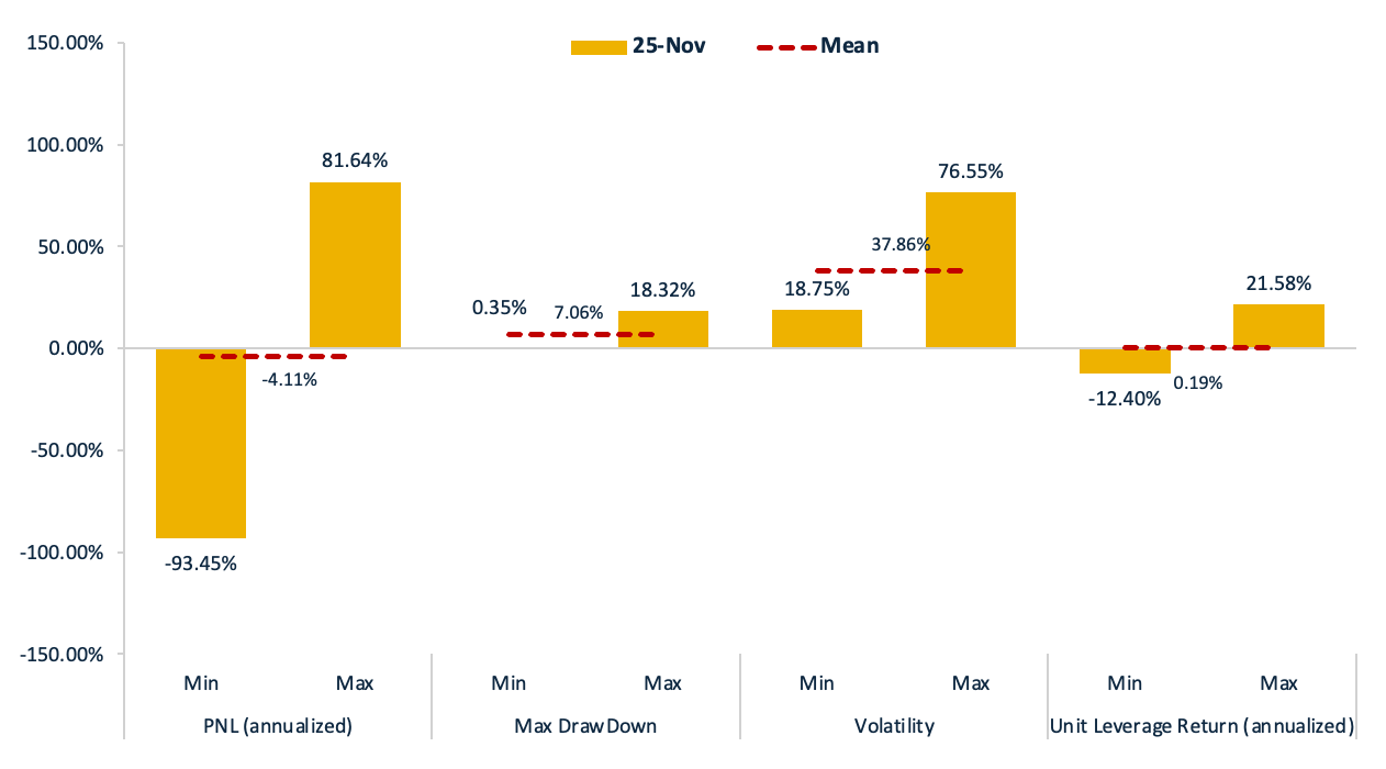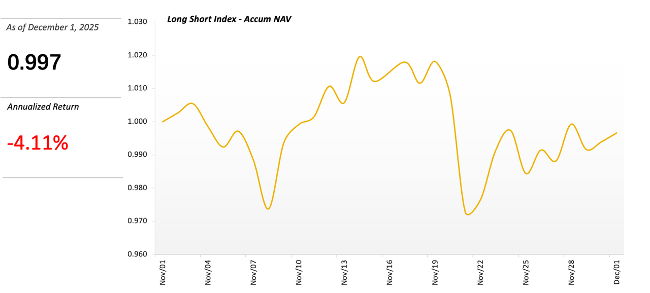 We have retrieved the assets of multiple crypto trading teams to the same starting point (November 1st at UTC 0) utilizing a historical retrieving mechanism, calculating the accumulated NAV for each team using the TWR (Time-Weighted Return) measure, and then taking the arithmetic mean to derive an index benchmark that represents the market’s Long Short strategy.