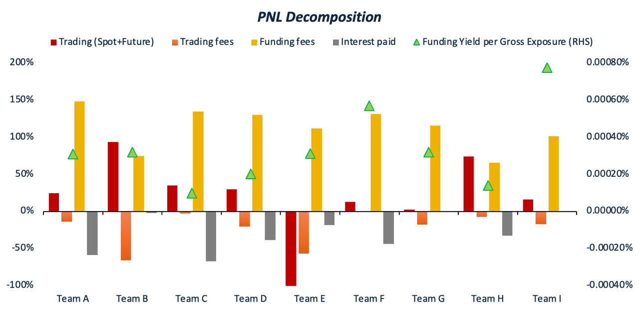 The perpetual contract funding rate management capability serves as a critical performance indicator for Funding Arbitrage strategies. In this report, we analyze November 2025 execution records across all participating teams, decomposing strategy returns into discrete components including funding income, trading fees, interest paid, and trading P&L. A higher proportion of funding income relative to total returns reflects greater proficiency in funding rate management.