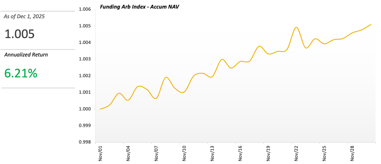 We have retrieved the assets of multiple crypto trading teams to the same starting point (November 1st at UTC 0) utilizing a historical retrieving mechanism, calculating the accumulated NAV for each team using the TWR (Time-Weighted Return) measure, and then taking the arithmetic mean to derive an index benchmark that represents the market’s Funding Arbitrage.