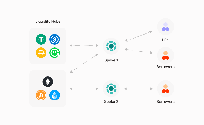 Aave V4 uses a Hub & Spoke model for liquidity management: the Liquidity Hub consolidates protocol-wide liquidity and accounting, while Spokes implements modular borrowing with isolated risk.