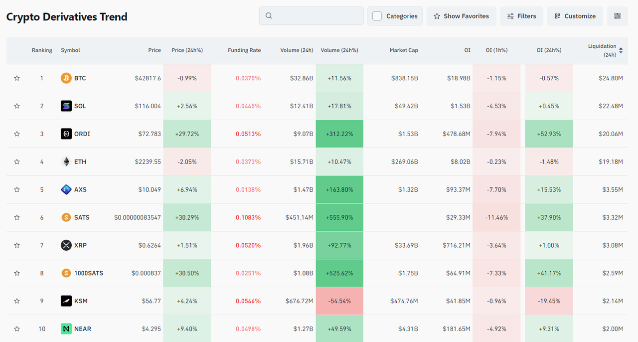 And how to quantify the popularity of these coins? Coinglass shows the derivatives trend, highlighting that the highest number of liquidations occur on BTC, SOL, and ORDI, with ETH following closely behind.
