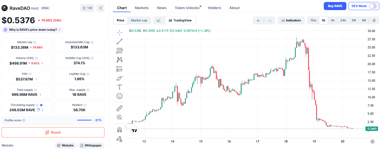 RAVE token pumped over 100x from $0.25 in beginning of the month, to $28 briefly entering the top 20 cryptocurrencies by market capitalization, then in less than 24 hours of hitting ATH crashed to less than $1, now at around $0.5.