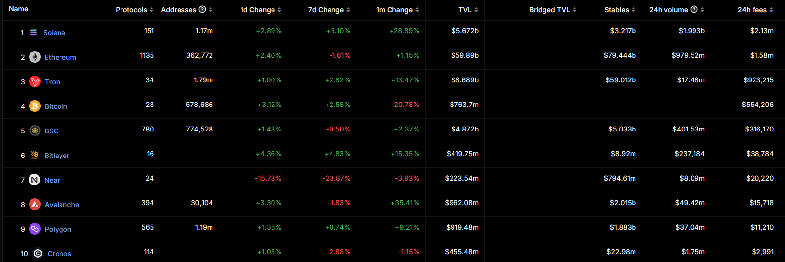 Detailed data can be seen on https://defillama.com/chains, Solana is now the largest chain in both 24h volume and 24h fees (Ethereum chain not including the L2s).
