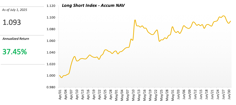 We have retrieved the assets of multiple crypto trading teams to the same starting point (April 1st at UTC 0) utilizing a historical retrieving mechanism, calculating the accumulated NAV for each team using the TWR (Time-Weighted Return) measure, and then taking the arithmetic mean to derive an index benchmark that represents the market’s Long Short strategy.