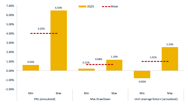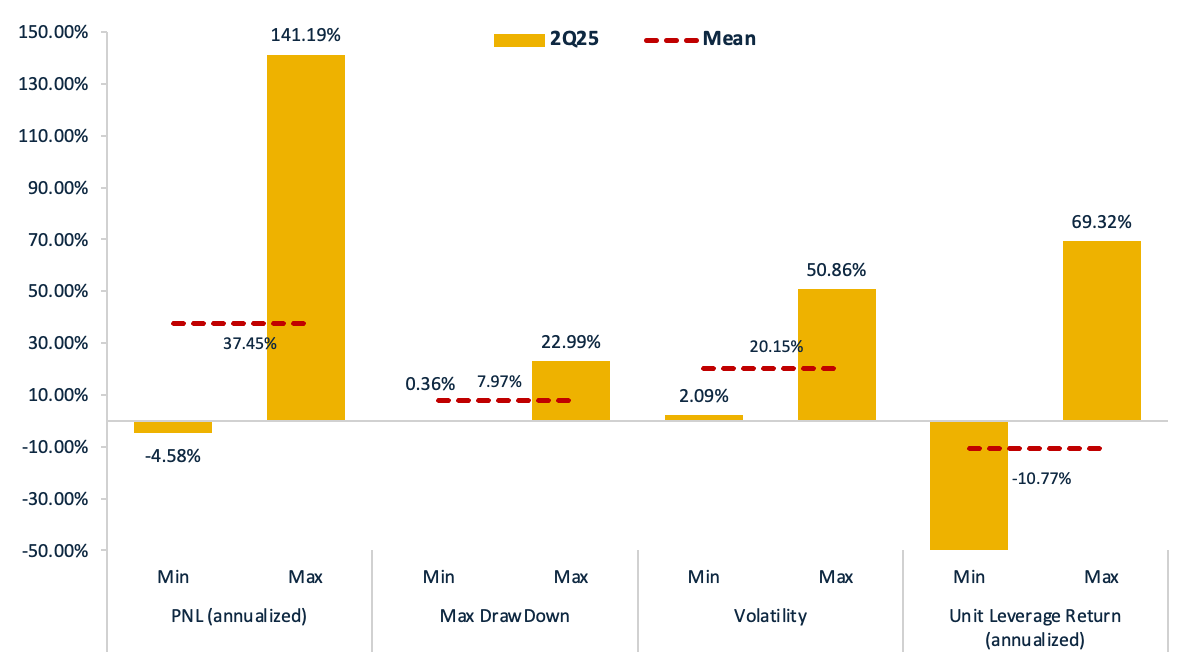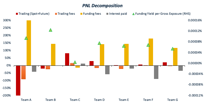 The perpetual contract funding rate management capability serves as a critical performance indicator for Funding Arbitrage strategies. In this report, we analyze 2Q 2025 execution records across all participating teams, decomposing strategy returns into discrete components including funding income, trading fees, interest paid, and trading P&L. A higher proportion of funding income relative to total returns reflects greater proficiency in funding rate management.