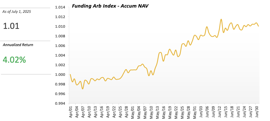 We have retrieved the assets of multiple crypto trading teams to the same starting point (April 1st at UTC 0) utilizing a historical retrieving mechanism, calculating the accumulated NAV for each team using the TWR (Time-Weighted Return) measure, and then taking the arithmetic mean to derive an index benchmark that represents the market’s Funding Arbitrage.