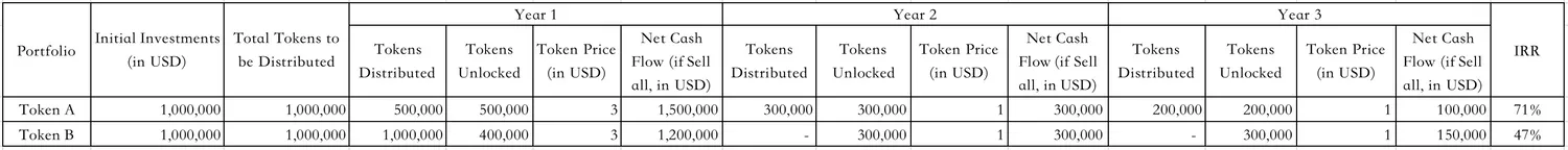 Apart from the projects' short-term profitability, long-term vision, team background, products, markets, ecosystem and so on, there are unique factors in token/ SAFT investment scenarios that need to be considered. ‘Tokenomics’ as an example, is the economics of a token, which includes everything from the token supply, issuance and utility, etc. With the same investments, total distributed tokens and token value, different vesting schedules and token unlock arrangements listed in the 'Tokenomics' can lead to completely different IRRs.